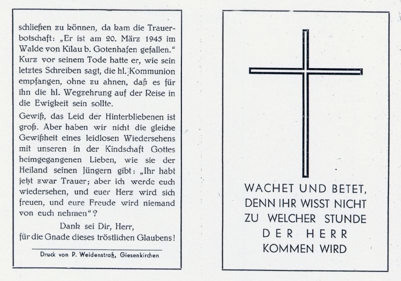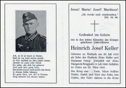 | Gefallener 2. Weltkrieg; Eltern: Peter Keller u. Marianne geb. Fabry; ∞ 13.7.1942 Alma Margarete Brand; 1 Sohn; Druck in Giesenkirchen |