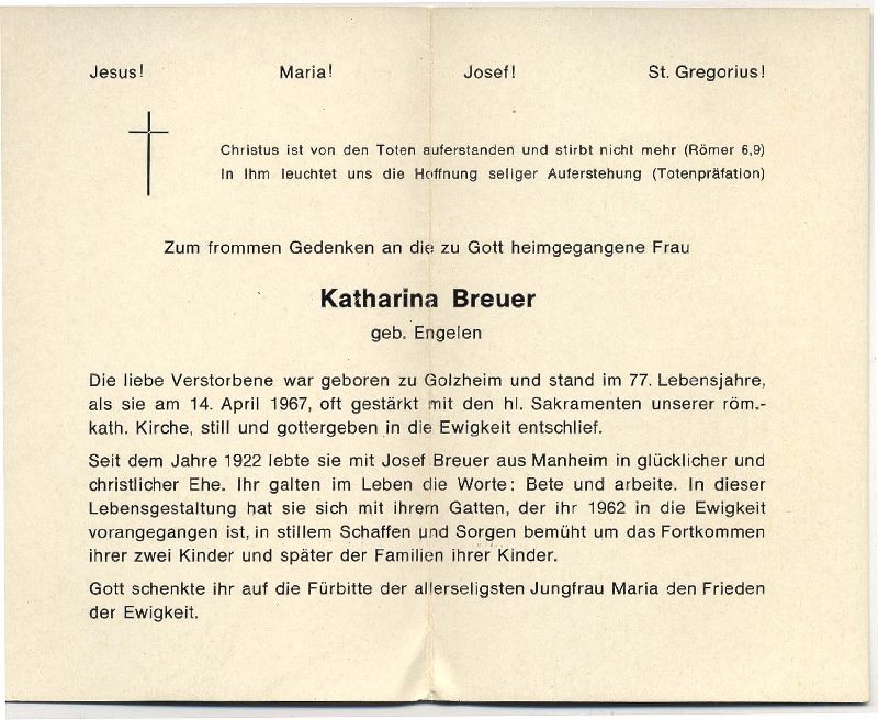 | ∞ 1922 Josef Breuer aus Manheim, † 1962; 2 K.; Wohnort: vermutl. Golzheim |