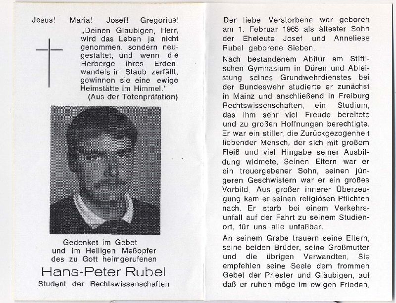 Wohnort: vermutl. Golzheim; Eltern: Josef Rubel u. Anneliese geb. Sieben; Abitur in Düren; Grundwehrdienst; Student der Rechtsissernschaft in Mainz, dann Freiburg; Tod bei Verkehrsunfall |