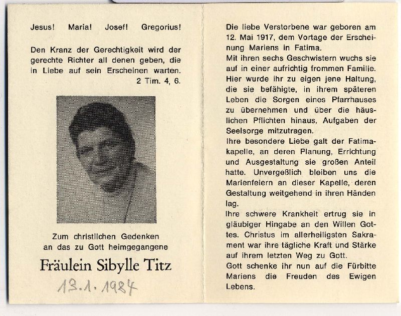 Wohnort: vermutl. Golzheim; Haushälterin im Pfarrhaus; hatte großen Anteil an der Errichtung der Fatimakapelle |
