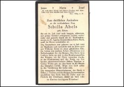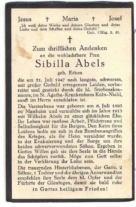 Wohnort: Manheim; ∞ 1913 Wilhelm Abels; 2 Söhne, 1 Tochter; im 2. Weltkrieg wurde ihr Heim durch Bombenangriffe vernichtet; Evakuierung; zwei Söhne wurden schwer verwundet |