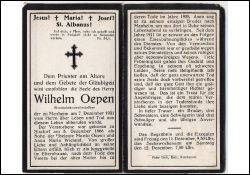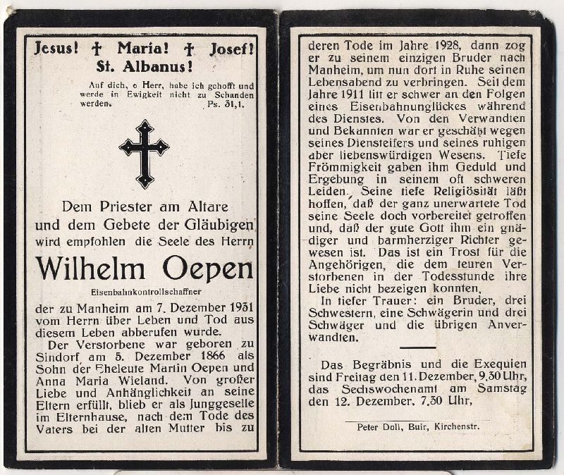 Eisenbahnkontrollschaffner; Eltern: Martin Oepen u. Anna Maria geb. Wieland; blieb als Junggeselle im Elternhaus bis zum Tod der Mutter 1928, zog dann zum einzigen Bruder nach Manheim; litt seit 1911 schwer an Folgen eines Eisenbahnunglückes |