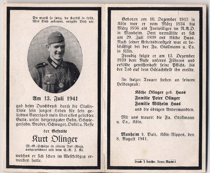 Gefallener 2. Weltkrieg; März 1934 bis März 1936 als Freiwilliger im RAD in Manheim; dort ∞ 29.7.1939 Käthe Haas; beschäftigt b. Fa. Stallmann u. Co. in Köln; Wohnort: Manheim |