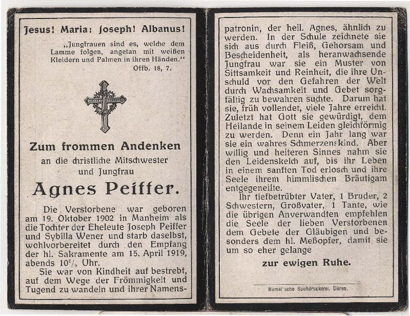 Jungfrau: Eltern: Joseph Peiffer u. Sybilla geb. Wener; 1 Jahr lang leidend |