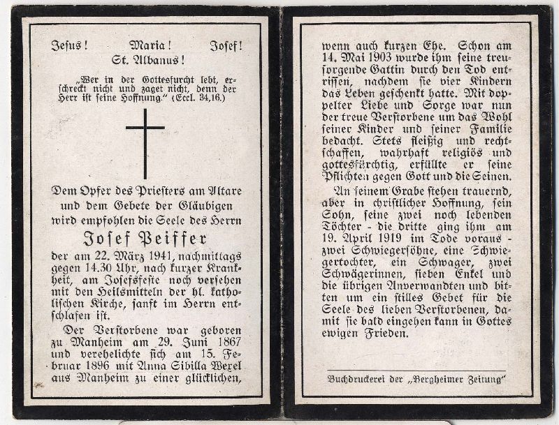 Wohn: Manheim; ∞ 15.2.1896 Anna Sibilla Wexel aus Manheim, † 14.5.1903; 4 K., davon 1 Tochter † 19.4.1919 |