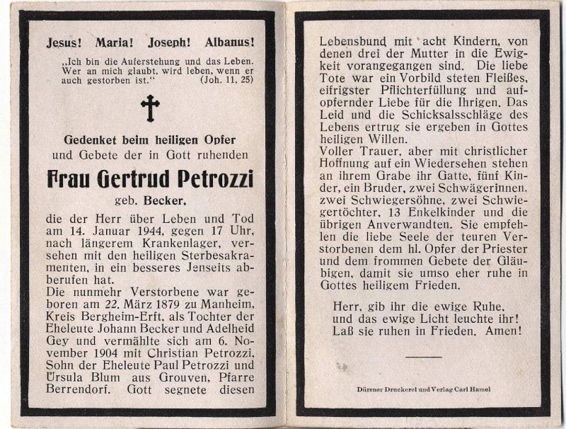 Wohnort: vermutl. Manheim; längeres Krankenlager; Eltern: Johann Becker u. Adelheid geb. Gey; ∞ 6.11.1904 Christian Petrozzi, Sohn von Paul Petrozzi u. Ursula geb. Blum aus Grouven, Pfarre Berrendorf; 8 K., davon 3 †; |
