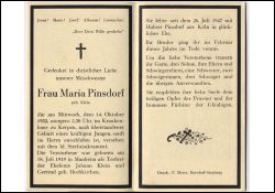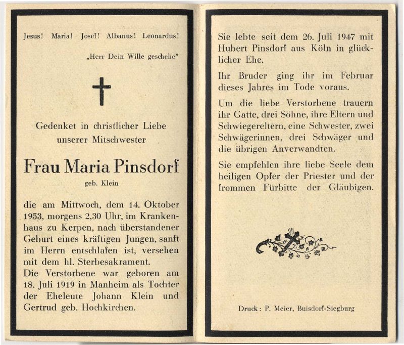Wohnort: vermutl. Manheim; Tod nach Geburt eines Jungen; Eltern: Johann Klein u. Gertrud geb. Hochkirchen; ∞ 26.7.1947 Hubert Pinsdorf aus Köln; ihr Bruder † Febr. 1853; 3 überlebende Söhne |