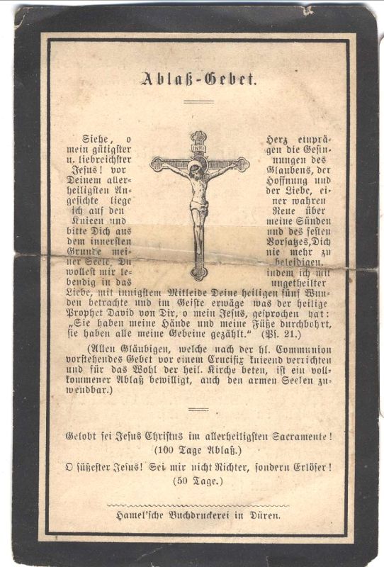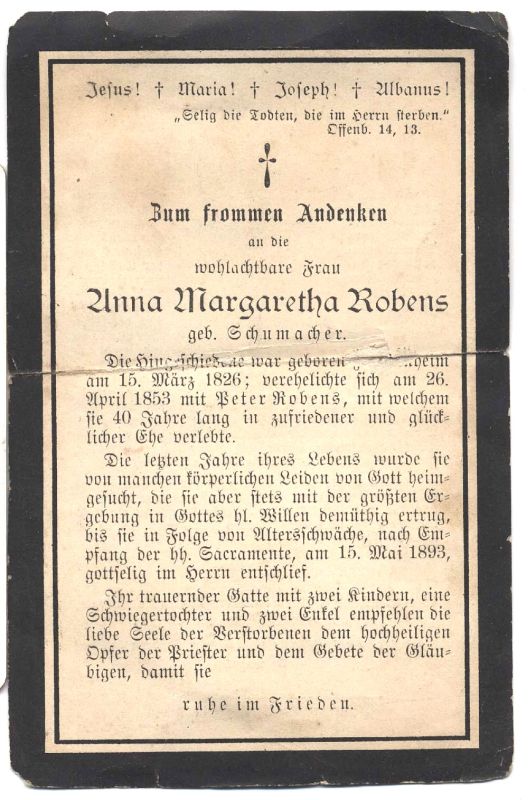 ∞ 26.4.1853 Peter Robens, † n. 40 J.; in den letzten Jahren leidend; 2 überlebende Kinder |