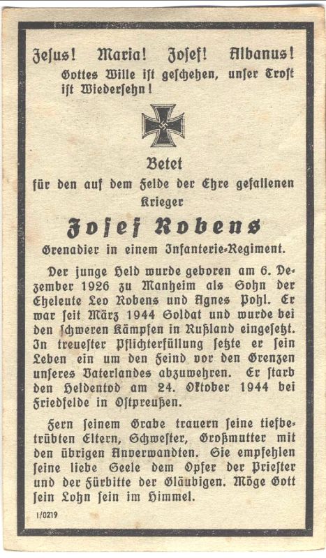 Gefallener 2. Weltkrieg; Eltern: Leo Robens u. Agnes geb. Pohl; seit März 1944 Soldat |