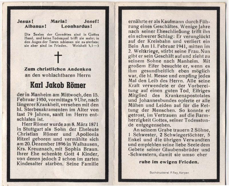 Eltern: Christian Römer u. Apollonia geb. Ritzel; ∞ 20.12.1896 in Walhausen (Kr. Kreuznach) Sohpia Brau, † 11.2.1941n; 4 K., davon 2 früh †; selbständiger Kaufmann; nach wenigen Ehejahren verlor er durch Eisenbahnunglück ein Bein; Nach dem Tod seiner Frau gab er sein geschäft auf und zog zu seinem Sohn nach Manheim; |