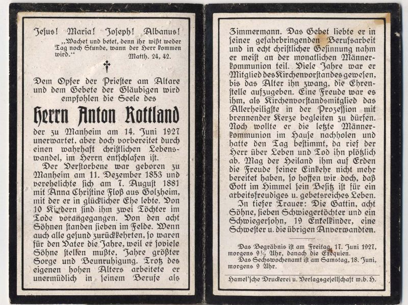 ∞ 7.8.1881 Anna Christine Floß aus Golzheim; 10 K., davon 2 †; 7 Söhne standen im Feld; alle kehrten zurück; Beruf: Zimmermann; Mitgl. Kirchenvorstand |