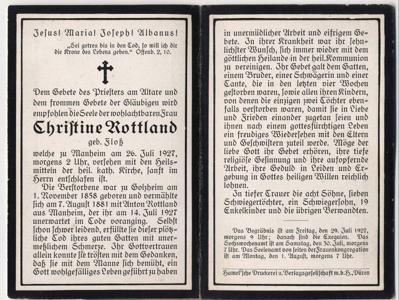 Wohnort: Manheim; ∞ 7.8.1881 Anton Rottland aus Manheim, † 14.7.1927; damals schon schwer leidend; 8 überlebende Söhne, 2 Töchter †; |
