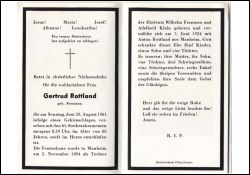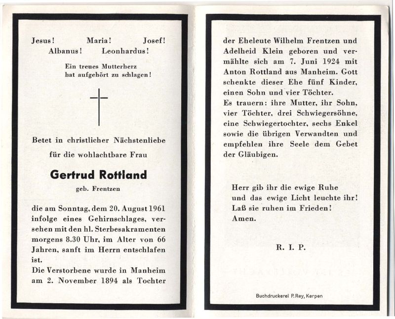 Wohnort: vermutl. Manheim; Tod durch Gehirnschlag; Eltern: Wilhelm Frentzen u. Adelheid geb. Klein; ∞ 7.6.1924 Anton Rottland aus Manheim; 5 K. |