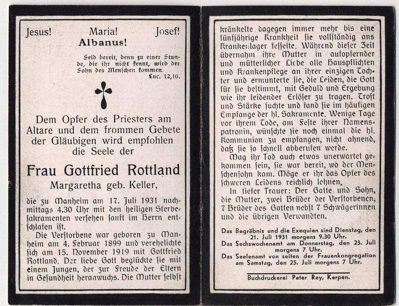 Wohnort: Manheim; ∞ 15.11.1919 Gottfried Rottland; 1 Sohn; sie selbst kränkelte 5 J. lang und war dann an das Bett gefesselt, ihre Mutter pflegte sie |