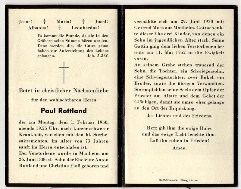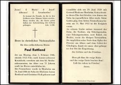 Wohnort: vermutl. Manheim; Eltern: Anton Rottland u. Christine geb. Floß; ∞ 29.6.1920 Gertrud Mock aus Manheim, † 11.5.1952; 3 K., davon 1 jugendl. †; |