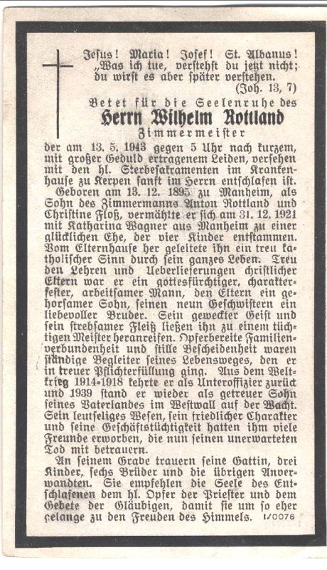 Wohnort: Manheim; Zimmermeister; Eltern: Anton Rottland u. Christine geb. Floß; ∞ 31.12.1921 Katharina Wagner aus Manheim; 4 K.Soldat im 1. Weltkrieg, 1939 stand er wieder am Westwall; |