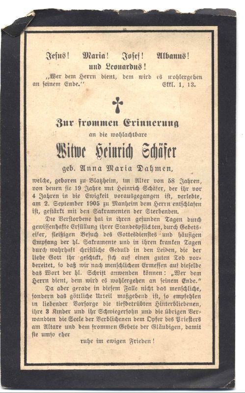 58 J.; 19 J. Ehe mit Heinrich Schäfer, † vor 4 J.; 3 überlebende Kinder |