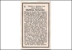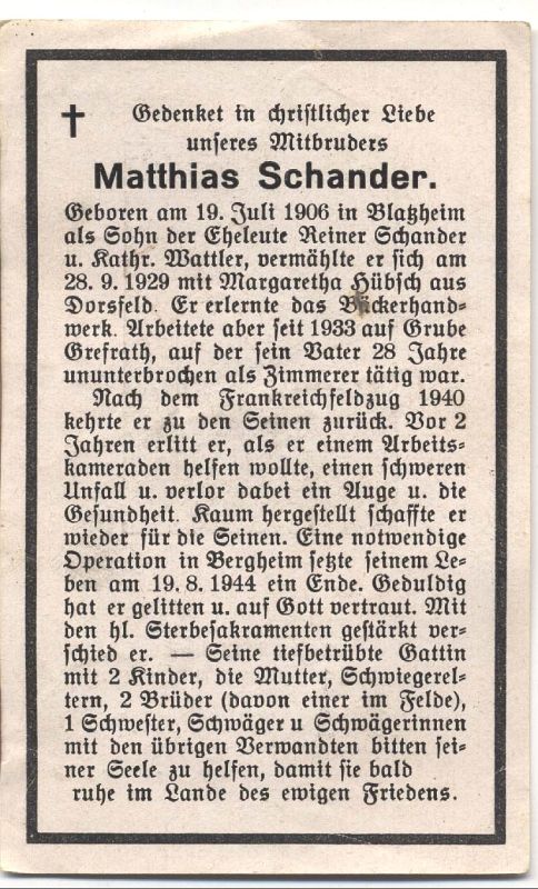 Wohnort: Manheim; Eltern: Reiner Schander u. Katharina geb. Wattler; ∞ 28.9.1929 Margaretha Hübsch aus Dorsfeld; Bäckerhandwerk, arbeitete aber seit 1933 auf Grube Grefrath, wo sein Vater seit 28J. Als Zimmerer tätig war; kehrte 1940 vom Frankreichfeldzuf zurück; durch Arbeitsunfall vir 2 J. verlor er ein Auge und die Gesundheit; Tod nach Operation |