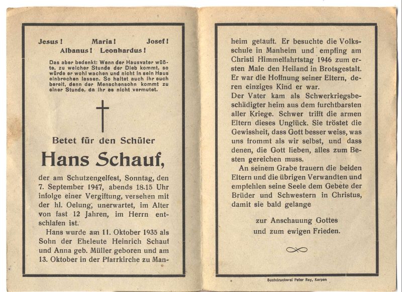 Schüler; Tod durch Vergiftung; Vater kam als Schwerkriegsbeschädigter aus dem 2. Weltkrieg zurück |