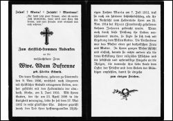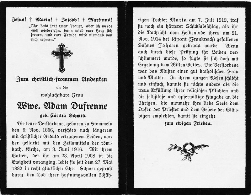 | ∞ 27.5.1882 Adam Dufrenne, † 23.4.1908;Tochter Maria † 7.7.1912, 23 J.; Sohn Johann fiel am 21.11.1914 bei Ripont, Frankreich |