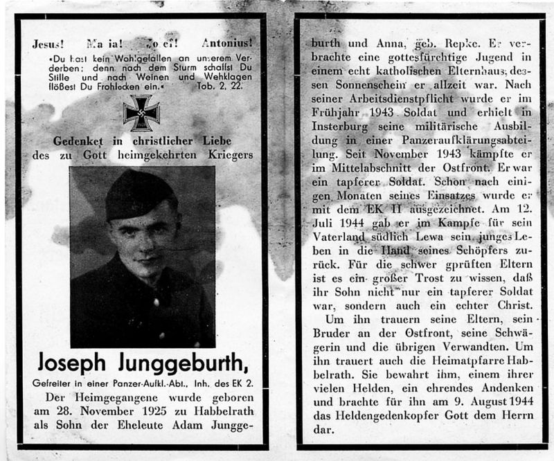 Gefallener 2. Weltkrieg; Eltern: Adam Junggeburth u. Anna gab. Repke; seit Frühj. 1943 Soldat; seit Nov. 1943 an der Ostfront; Bruder ebenfalls an der Ostfront |