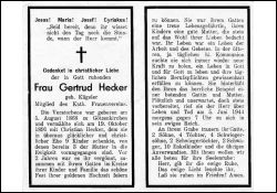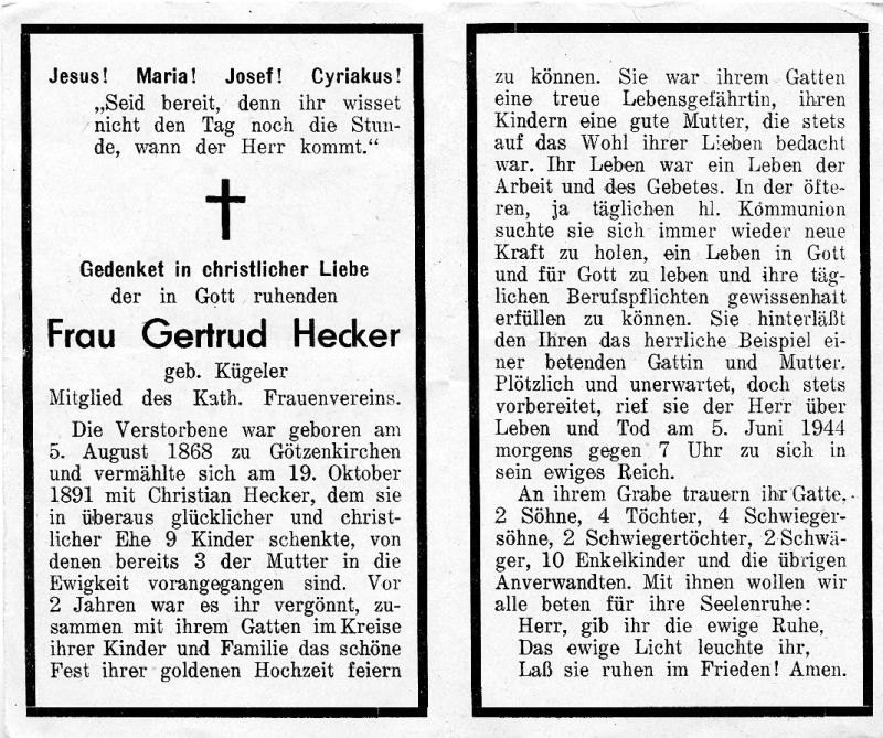 ∞ 19.10.1891 Christian Hecker; 9 K., davon 3 †; Goldhochzeit; |