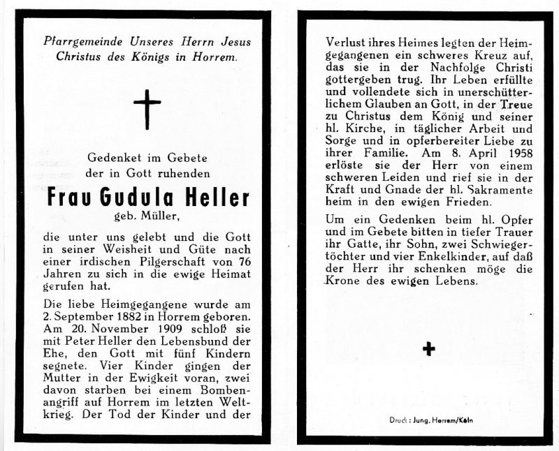 ∞ 20.11.1909 Peter Heller; 5 K., davon 4 † (2 davon starben bei einem Bombenangriff im 2. Weltkrieg auf Horrem); dabei das Heim zerstört |