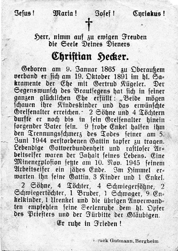 ∞ 19.10.1891 Gertrud Kügeler, † 5.6.1944; 6 K.; Opfer 2. Weltkrieg: Tod durch Minenexplosion |