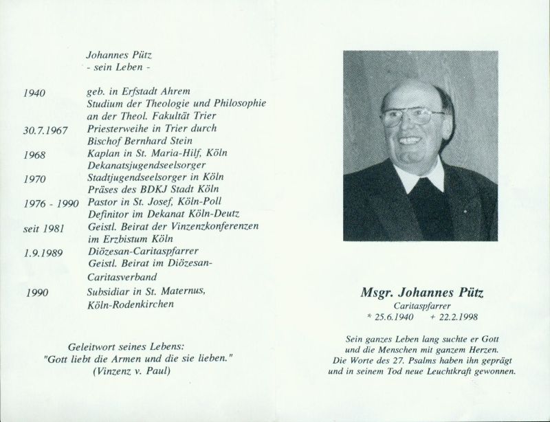 Caritaspfarrer; 30.7.1967 Priesterweihe; Kaplan und Pastor in Köln |