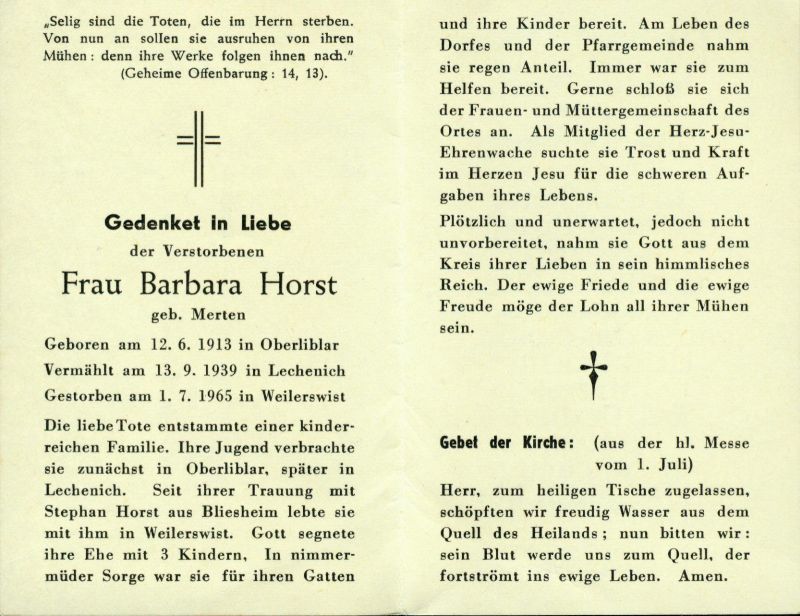 ∞ 13.9.1939 Stephan Horst aus Bliesheim; 3 K.; Mitgl. Frauen- und Müttergemeinschaft, Herz-Jesu-Ehrenwache |