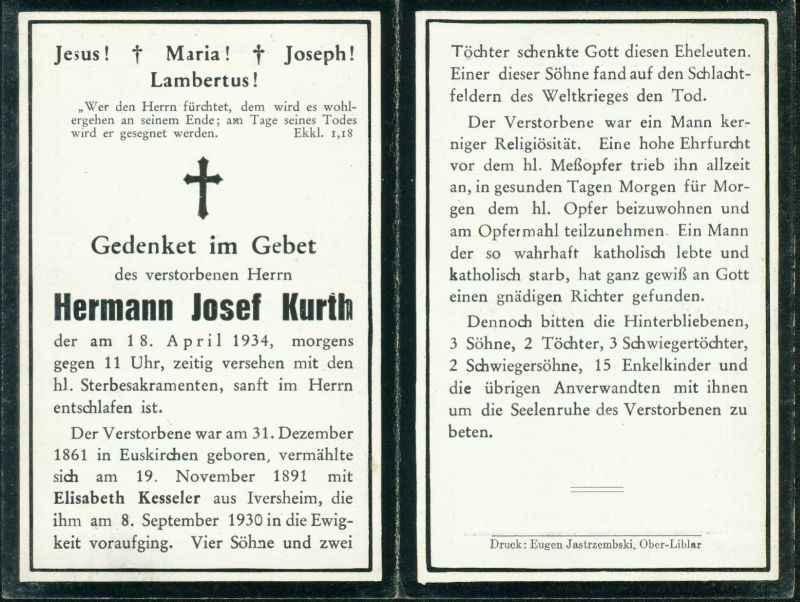 ∞ 19.11.1891Elisabeth Kesseler aus Iversheim 8.9.1930 †; 6 K. davon 1 gefallen. |