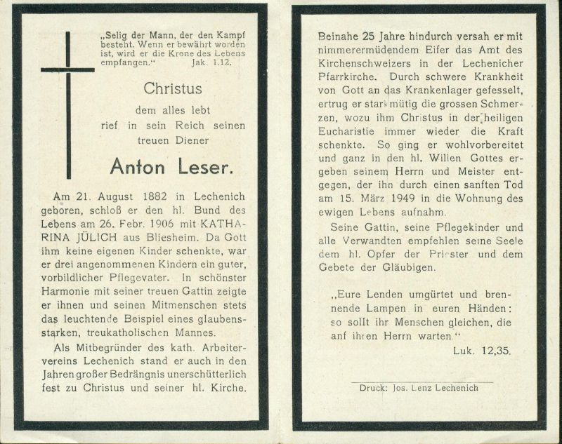 ∞ 26.2.1906 Katharina Jülich; 3 adoptiv K.; Mitbegründer d. kath.Arbeitervereins Lechenich; Kirchenschweitzer Pfarrk. Lechenich |