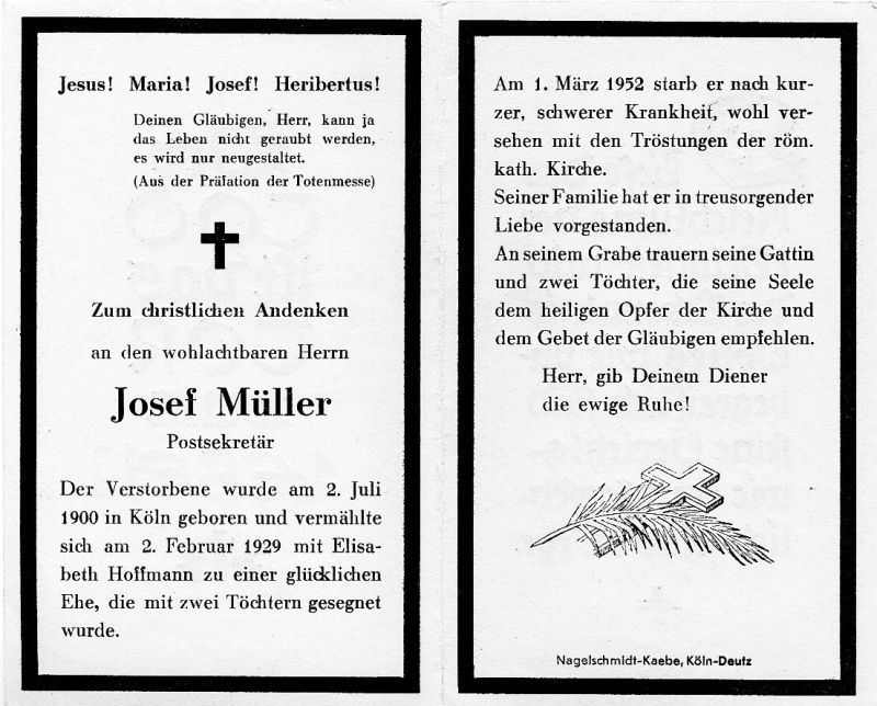 Postsekretär; ∞ 2.2.1929 Elisabeth Hoffmann; 2 Töchter (Köln-Deutz) |