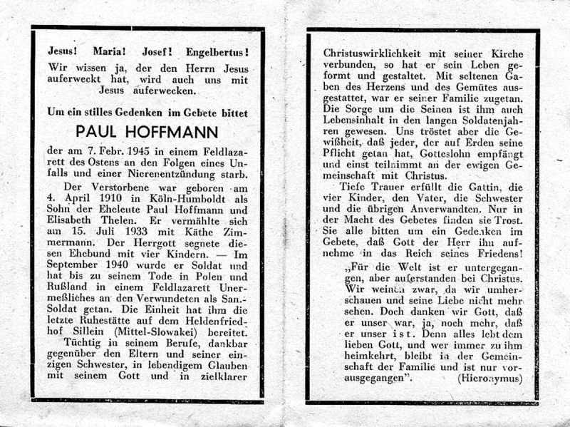 Gefallener 2. Weltkrieg; Sanitäter; † im Feldlazarett (Unfall, Nierenentzündung); Eltern: Paul Hoffmann u. Elisabeth geb. Thelen; ∞ 15.7.1933 Käthe Zimmermann; 4 K.; Heldenfiriedhof Sillein (Slowakei) |