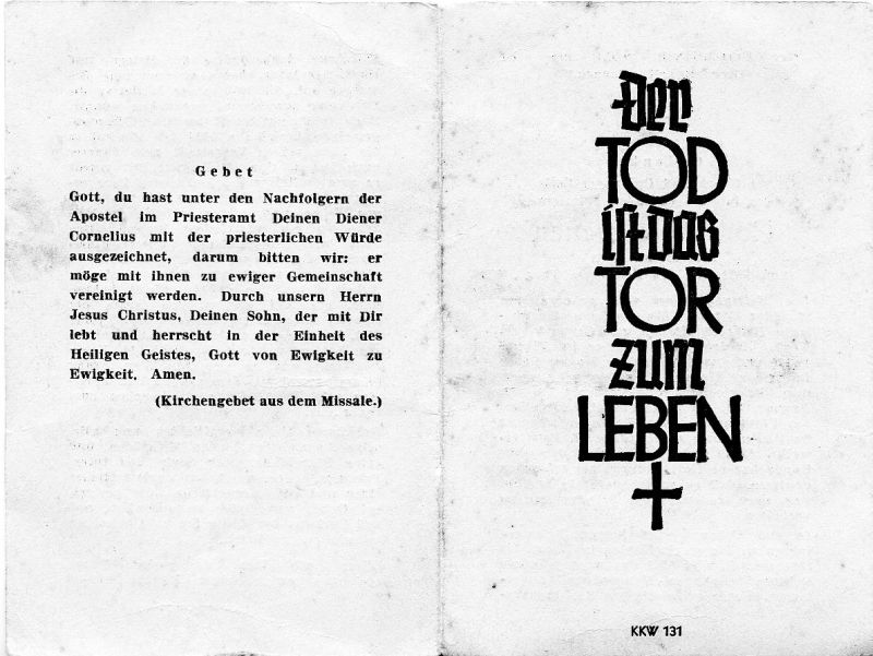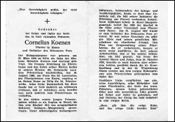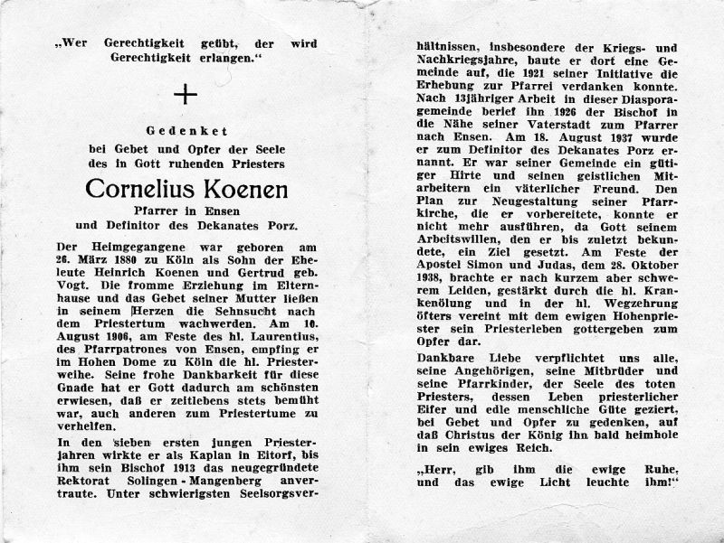 Eltern: Heinrich Koenen u. Gertrud geb. Vogt; 10.8.1906 Priesterweihe Köln; Kaplan in Eitorf (7 J.), Rektor, seit 1921 Pfarrer in Solingen-Mangenberg; 1926 Pfarrer in Ensen |