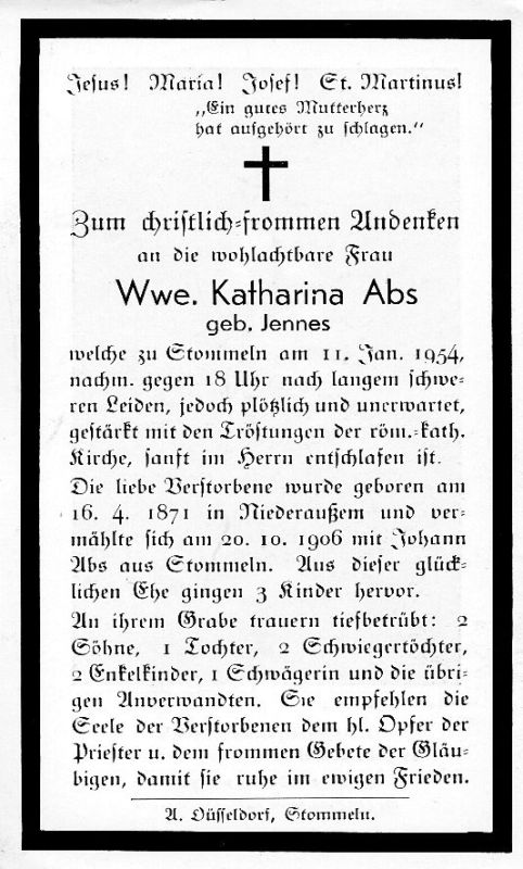 ∞ 20.10.1906 Johann Abs aus Stommeln; 3 K. |