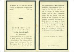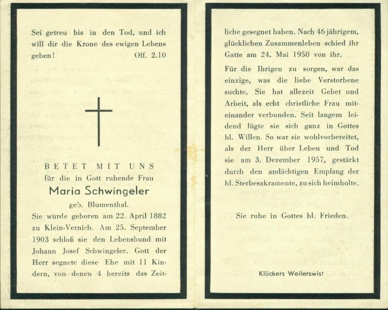 ∞ 25.9.1903 Johann Josef Schwingeler 24.5.1950 †; 11 K. davon 4† |