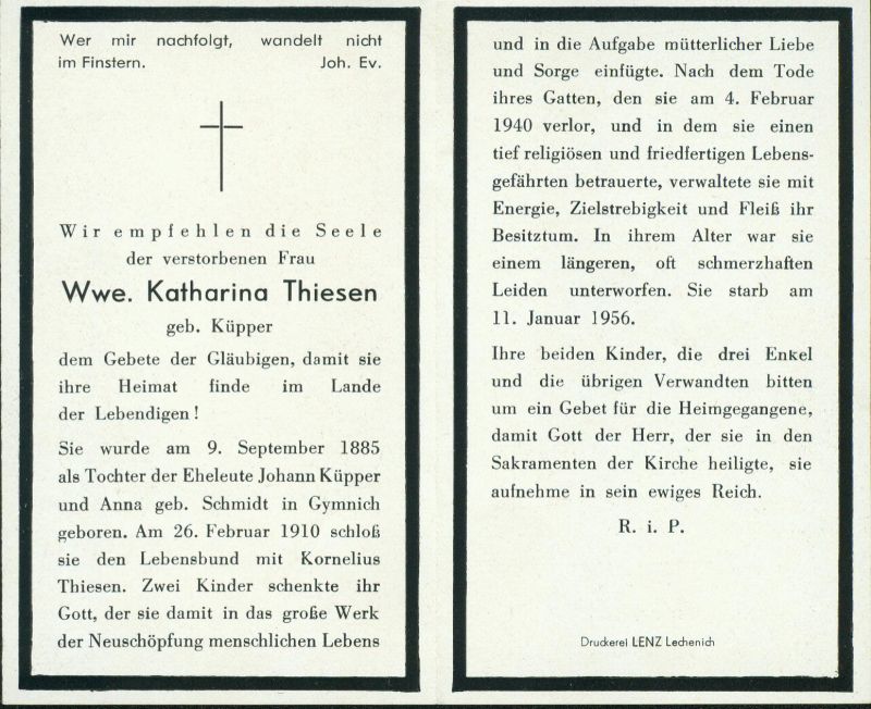 Eltern: Johann Küpper und Anna Schmidt; ∞ Kornelius Thiesen 4.2.1940 †; 2 K. |