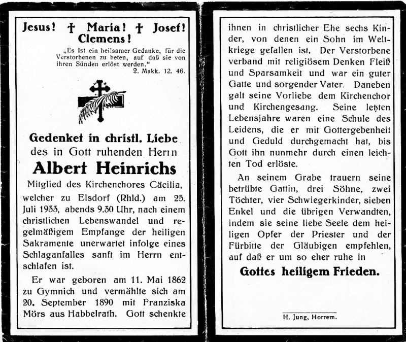 ∞ 20.9.1890 Franziska Mörs aus Habbelrath; 6 K., daov 1 Sohn im 1. Weltkrieg gefallen; Mitgl. d. Kirchenchores |