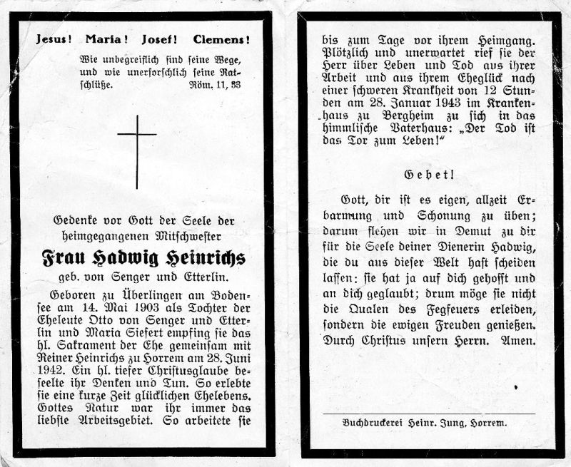 Eltern: Otto von Senger u. Etterlin u. Maria geb. Siefert; ∞ 28.6.1942 Reiner Heinrichs zu Horrem; arbeitete bis zum Tag ihres Heimgangs |