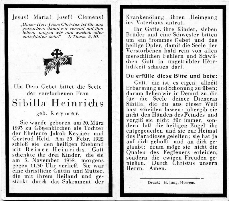 Eltern: Jakob Keymer u. Gertrud geb. Held; ∞ 25.2.1922 Reiner Heinrichs; 3 K. |