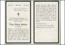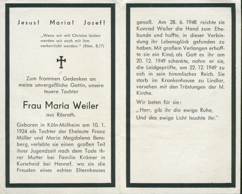 Eltern: Franz Müller und Magdalena Bensberg †; 28.6.1948 Konrad Weiler; 1 K. |