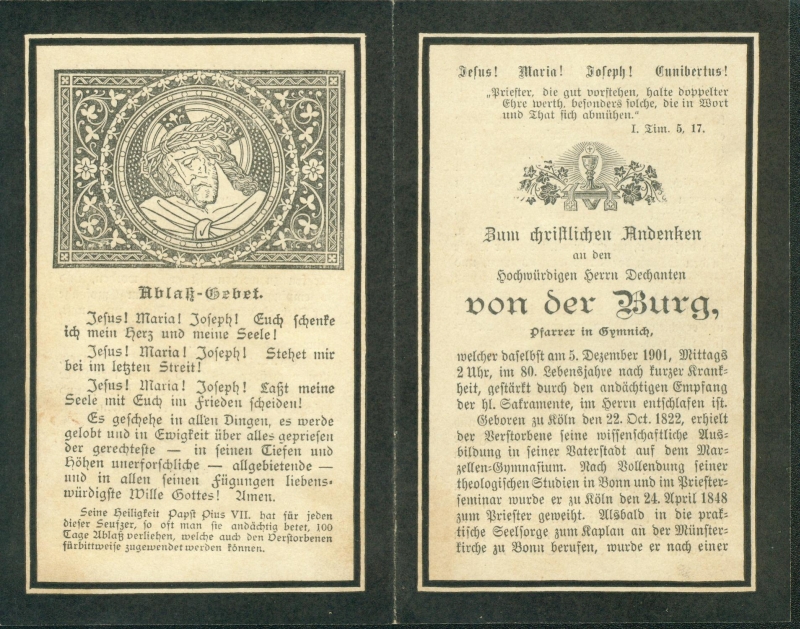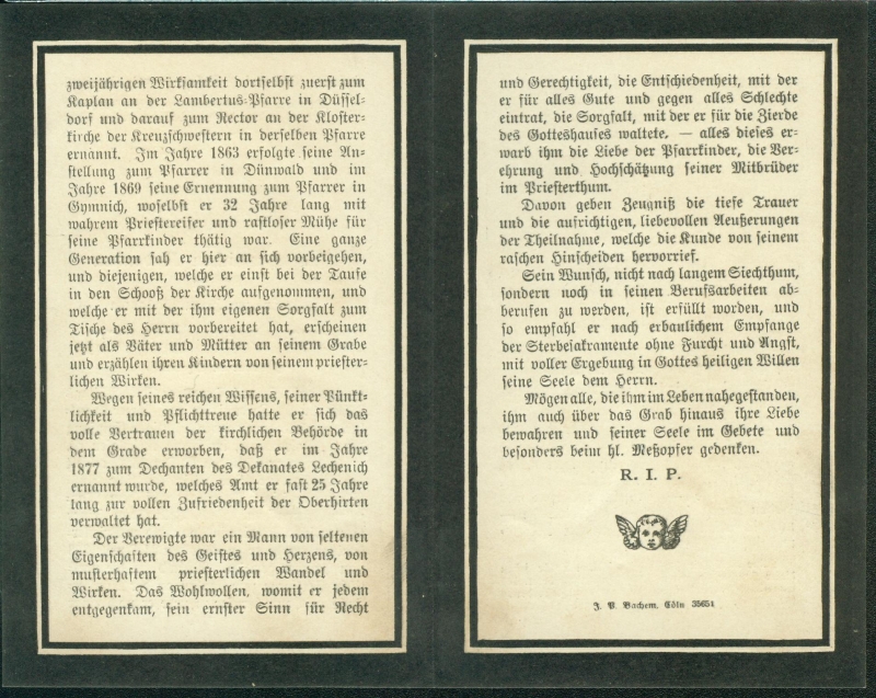 Pfarrer in Gymnich; Priesterweihe 24.4.1848; Tätigkeit in Bonn, Düsseldorf, Dünnwald, ab 1869 Gymnich |