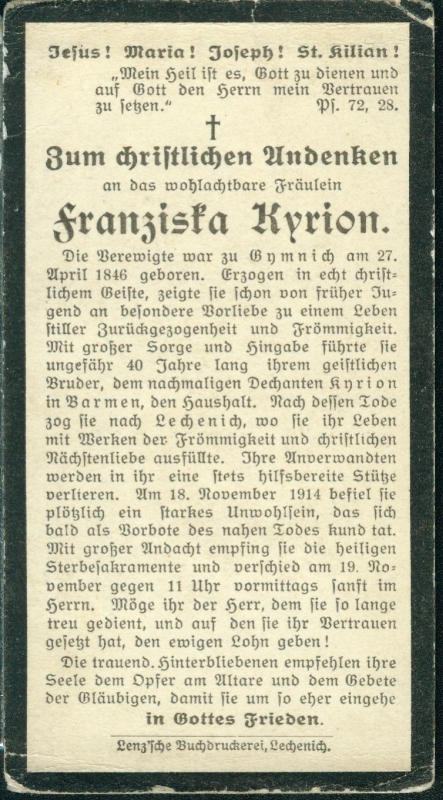 Haushälterin ihres Bruders Dechant Kyrion in Barmen |