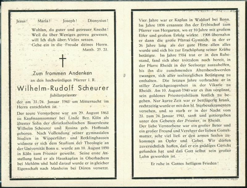 Pfarrer; Eltern: Wilhelm Scheurer und Rosina Hoffstadt; 10.8.1890 Priesterweihe, wirkte in Oberbachem b. Mehlem, Manheim b. Düren, Waldorf b. Bonn, Hergarten, 1908 bis 1934 in Gymnich, Rheidt |