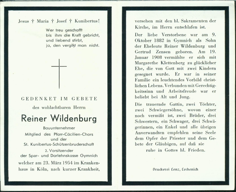 Bauunternehmer; Eltern: Reiner Wildenburg und Gertrud Zensen; ∞ 19.1.1908 Margarethe Klettenberg; 2 K.; Mitgl. Cäcilienchor, St. Kunibertus-Schützenbruderschaft, 2. Vors. Spar- u. Darlehnskasse Gymnich |