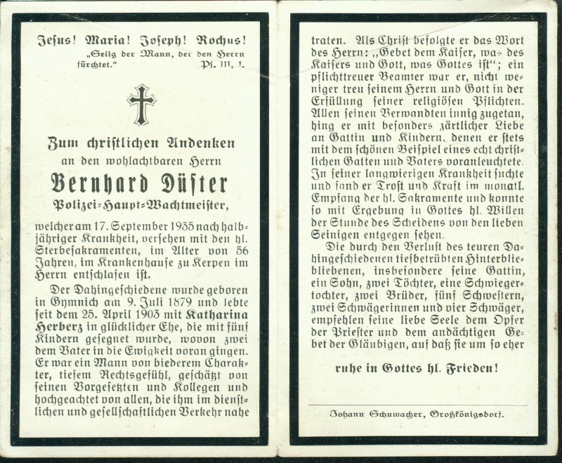 Polizei- Haupt-Wachtmeister; ∞ 25.4.1903 Katharina Herzberg; 5 K. davon 2 † |