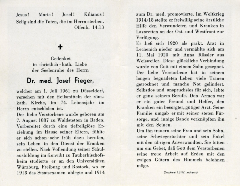 Arzt; ∞ 11.5.1920 Anna Rössler; 1 K.; Studium Würzburg, Freiburg, Rostock, 1914 Promotion; 1914/18 freiw. Dienst in Lazaretten Ost- u. Westfront; ab 1920 prakt. Arzt in Lechenich |