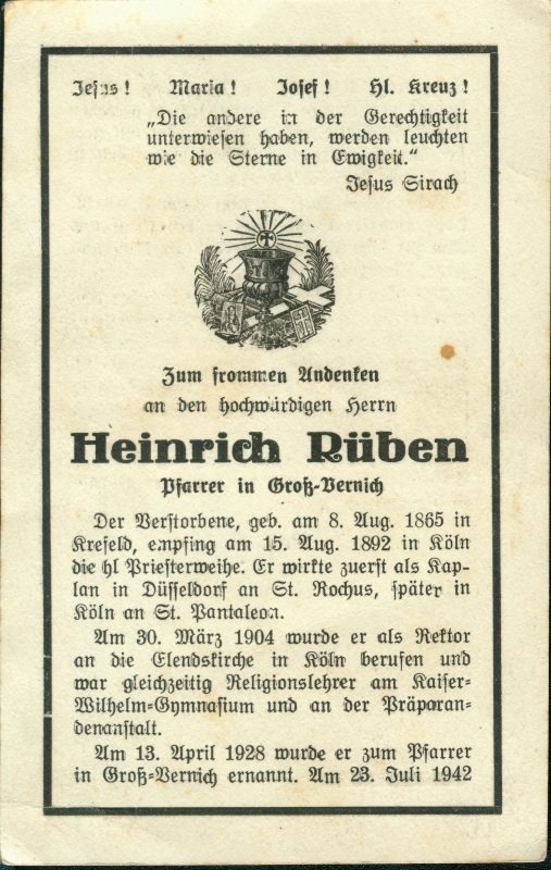 15.8.1892 Priesterweihe; Kaplan in Düsseldorf und Köln; 30.3.1904 Rektor in Köln; 13.4.1928 Pfarrer Groß Vernich |