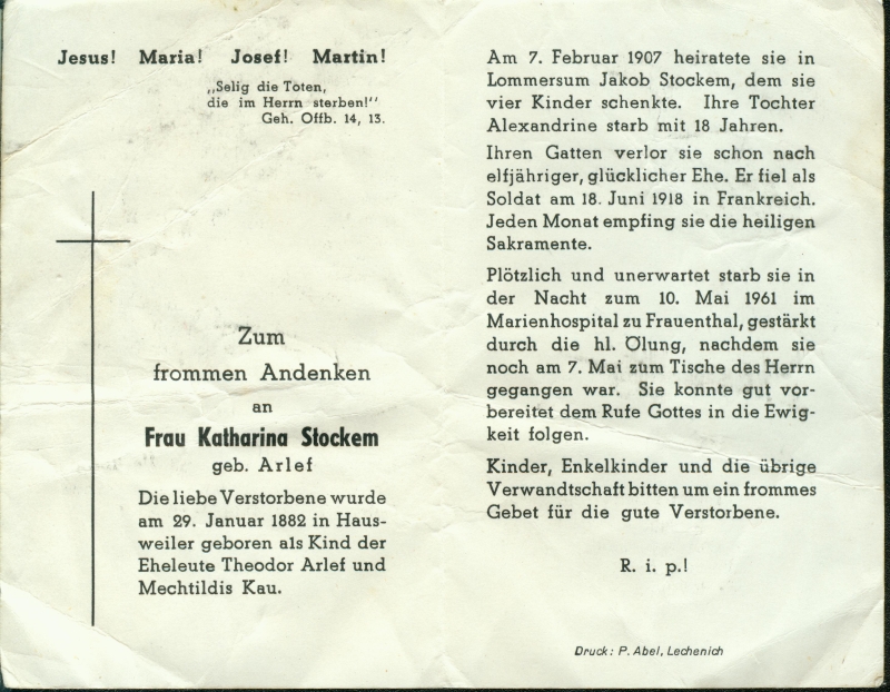 Eltern: Theodor Arlef und Mechtildis Kau; ∞ 7.2.1907 Jakob Stockem † 18.6.1918; 4 K. davon 1 † |